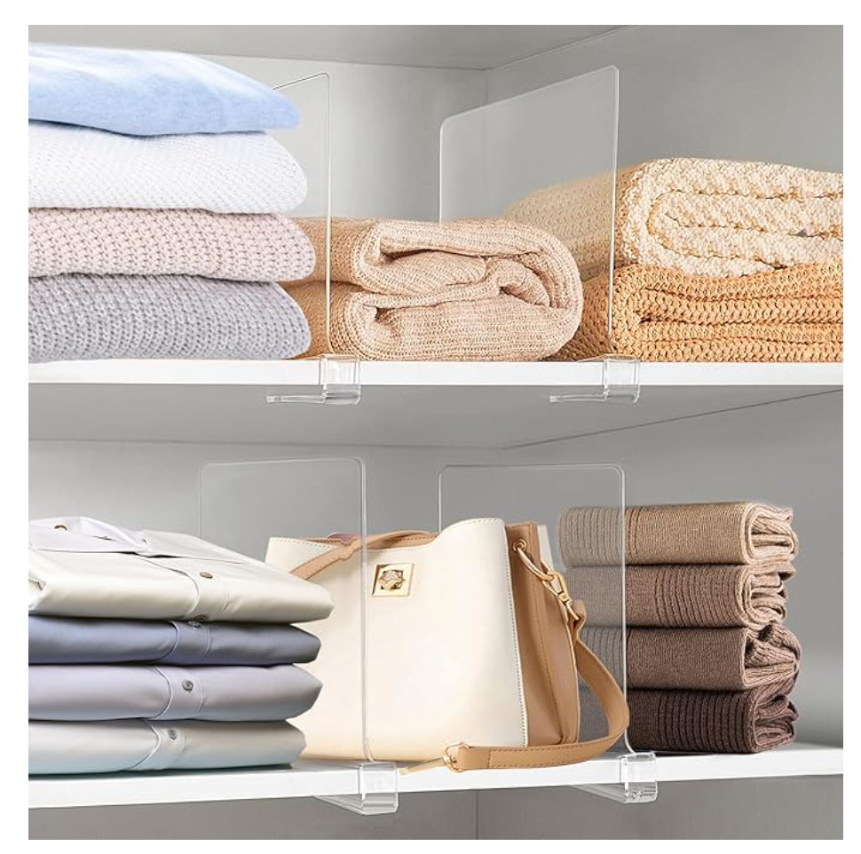 These tall acrylic dividers are great for shelfs that need space separation. You can move them around as needed, great for sheets and towels.